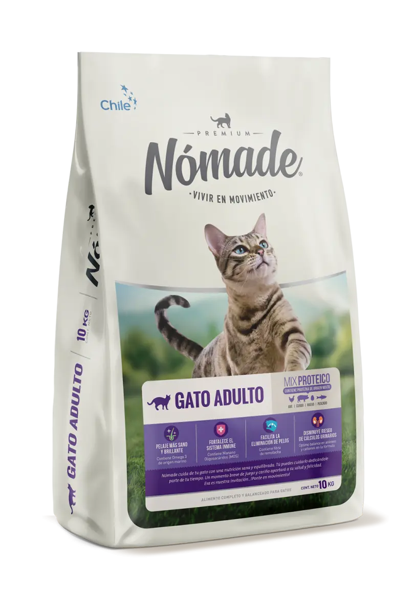 Nomade gato adulto 10 kgs alimento desarrollado por expertos en nutrición animal. Este alimento excede los requerimientos nutricionales de gatos adultos, incluso de las razas más exigentes, proporcionando una dieta sana y equilibrada para una vida plena, feliz y en movimiento.