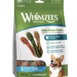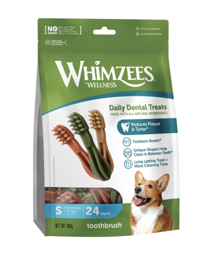 Los Whimzees Toothbrush son premios dentales 100% naturales con forma de cepillo de dientes, diseñados para hacer del cuidado bucal una experiencia divertida y efectiva. Su forma tridimensional única y su textura firme promueven una masticación prolongada, ayudando a eliminar la placa y el sarro de manera mecánica, mientras estimulan las encías y refrescan el aliento.